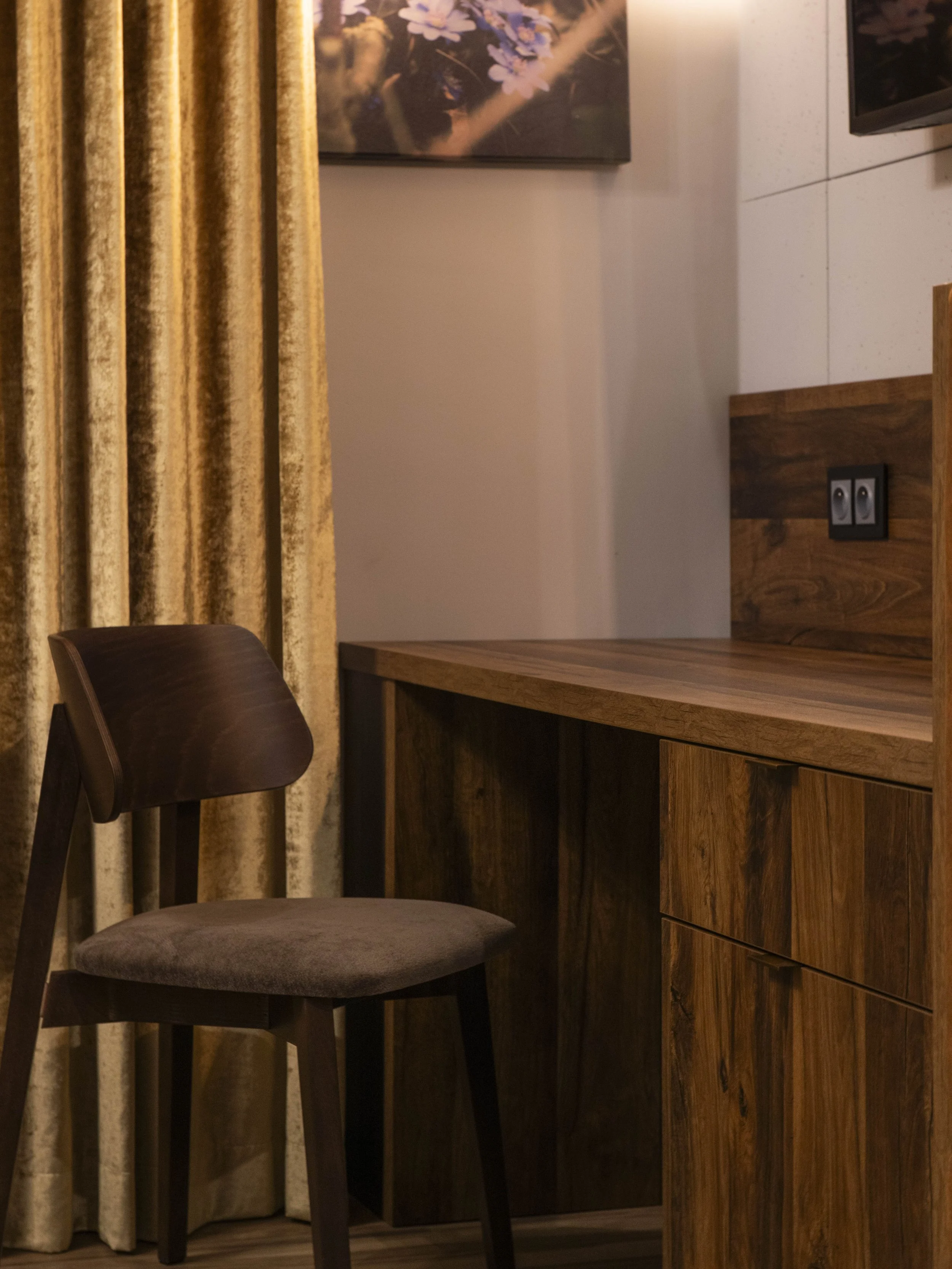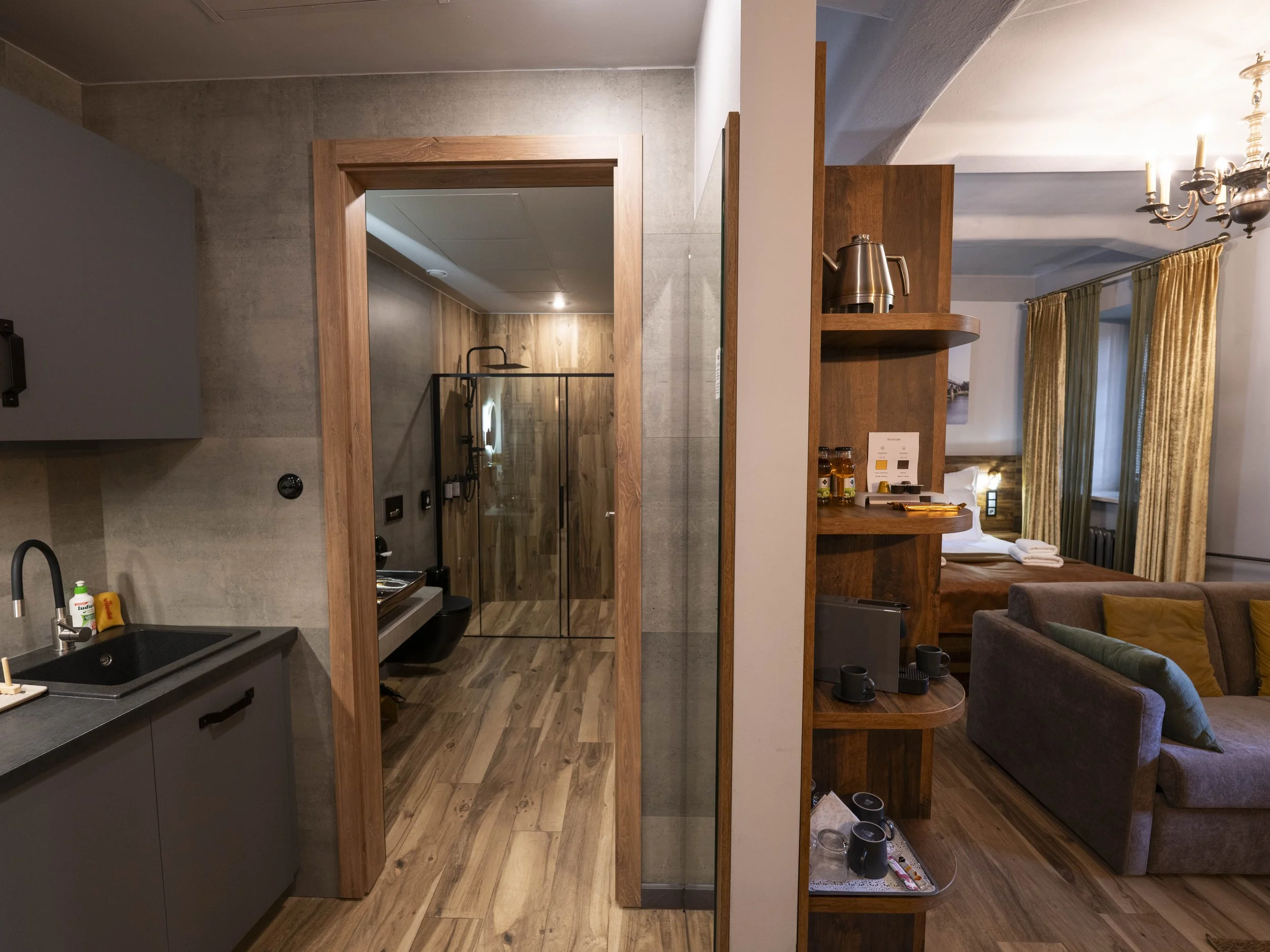 The City-Studio is a modern, single-space studio-type room with a soft, comfortable, and extendable corner couch for snuggly movie nights. The Living room side of the room has a large smart TV, a sideboard, and partial living room furniture.